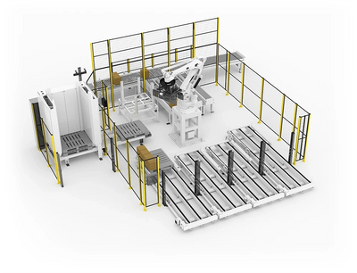 The case palletizer has a barcode scanner to organise the product ready for the palletizing line.