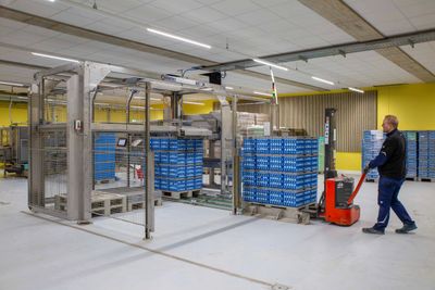 The de-palletiser is for use with a grader or breaker and has the capacity to process 90,000 eggs an hour or 220 cases.
